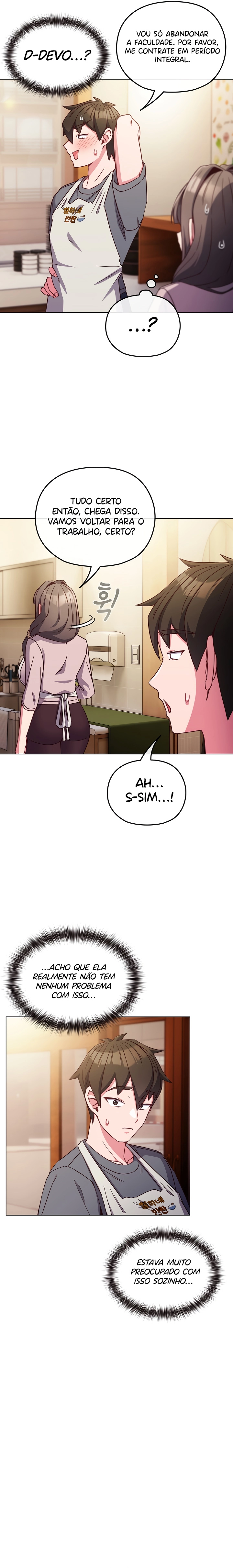 Sooyeon é uma mãe solteira dedicada que trabalha duro para manter sua pequena loja de acompanhamentos enquanto cria sua filha Seolha sozinha. Mesmo cansada e sobrecarregada, ela mantém um sorriso no rosto e tenta levar a vida da melhor forma possível. Seu dia a dia é simples, mas repleto de responsabilidades, e quase não há espaço para pensar em si mesma ou em seus próprios sentimentos. Tudo muda quando Hyunwoo entra em cena. Ele é um jovem de aparência intimidadora, com um jeito quieto e sério, mas extremamente responsável e prestativo no trabalho. Sooyeon o contrata como funcionário de meio período sem esperar muita coisa — até que começa a perceber detalhes que antes passavam despercebidos. Hyunwoo é gentil, respeitoso e sempre está atento às necessidades dela e da loja. Mesmo assim, por trás do olhar reservado, existe algo que Sooyeon não compreende totalmente. O choque acontece quando ela descobre, pouco a pouco, que Hyunwoo guarda sentimentos profundos por ela — sentimentos que ele tenta esconder devido à diferença de idade e ao fato de ela ser mãe de uma jovem da mesma idade que ele. A convivência diária aproxima os dois de forma inevitável: gestos pequenos, olhares trocados, conversas sinceras e uma crescente tensão emocional. A obra explora temas como solidão, desejo reprimido, culpa, amadurecimento e a busca por afeto em momentos inesperados. Sooyeon se vê dividida entre suas responsabilidades como mãe e o despertar de emoções que acreditava estar adormecidas. Já Hyunwoo luta contra seus impulsos e inseguranças, tentando encontrar um equilíbrio entre respeito e o amor crescente por essa mulher tão forte e vulnerável ao mesmo tempo.