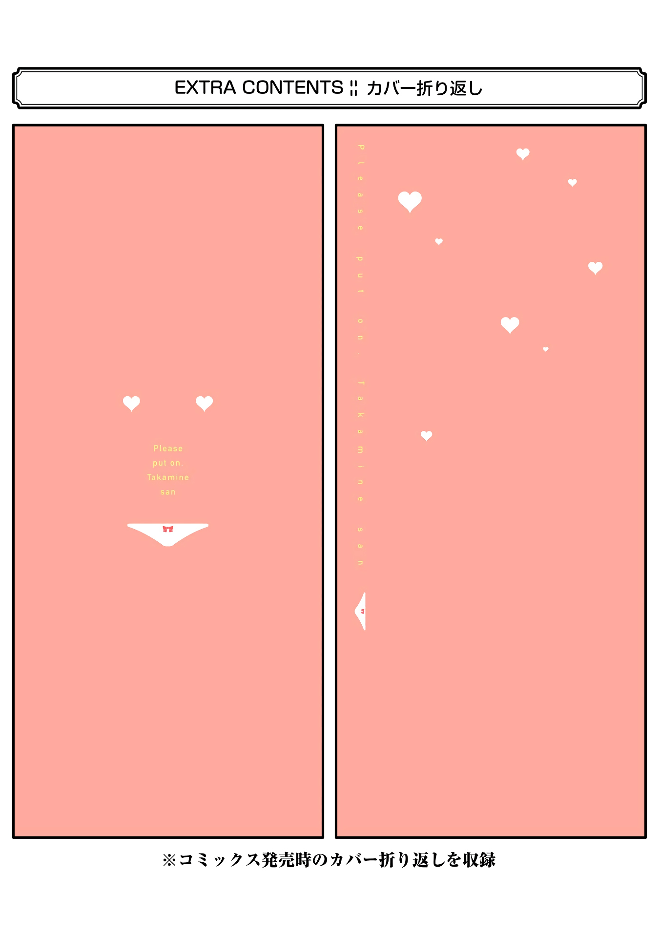 Takamine Takane is the goddess of her high school. With perfect grades, athletic prowess, and unrivaled beauty, this student council president sits at the top of the social pyramid. And then there's Shirota Koushi, a below-average student with no friends or social prospects to speak of. One day, Shirota-kun accidentally sees Takamine-san's naked breasts and finds out the secret behind her unbelievable success. From then on, his school life changes. "Become my closet!" Shirota is forced into underwear-putting-on servitude!? ___ **Alt Official Raw:** [niconico Manga](https://manga.nicovideo.jp/comic/46371) **Official English Volumes:** [Yen Press](https://yenpress.com/series/please-put-them-on-takamine-san)