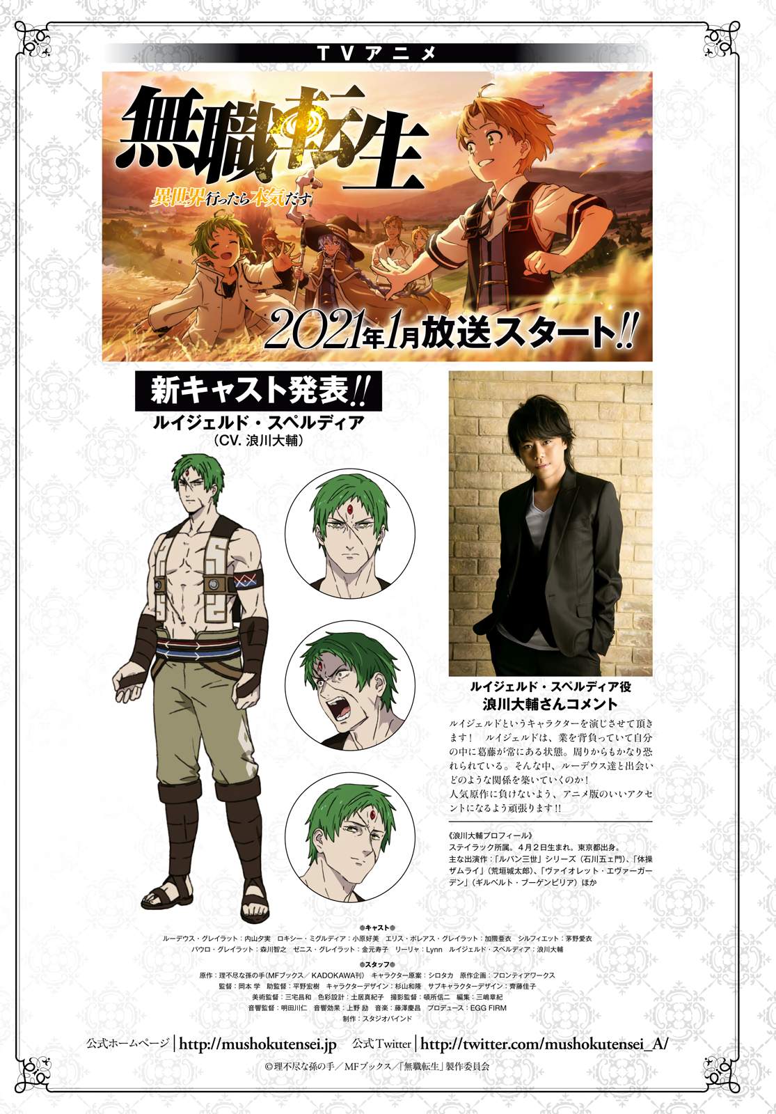 A 34-year-old NEET loses his life saving a stranger in a traffic accident, only to wake up to find himself reborn as the baby Rudeus Greyrat in a new world filled with magic. The child of the adventurers Paul and Zenith Greyrat, his innate talent for magic is immediately recognized when he turns two, and the magic tutor Roxy Migurdia is brought to his home to refine him into a mage. With a tremendous amount of magical power and a wealth of knowledge from his original world, Rudeus seeks to fulfill his only desires from his previous life—to not repeat the mistakes of his past and die with no regrets.