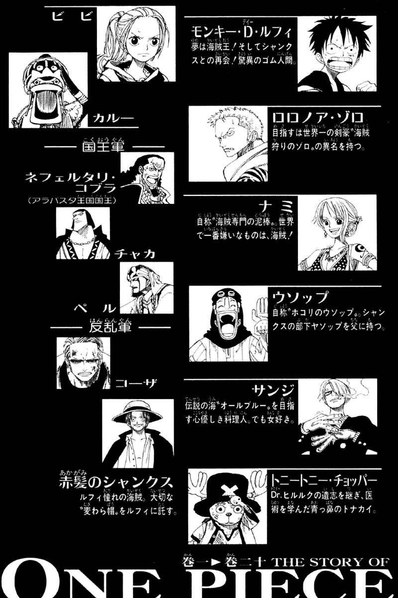 Gol D. Roger, a man referred to as the King of the Pirates, is set to be executed by the World Government. But just before his demise, he confirms the existence of a great treasure, One Piece, located somewhere within the vast ocean known as the Grand Line. Announcing that One Piece can be claimed by anyone worthy enough to reach it, the King of the Pirates is executed and the Great Age of Pirates begins. Twenty-two years later, a young man by the name of Monkey D. Luffy is ready to embark on his own adventure, searching for One Piece and striving to become the new King of the Pirates. Armed with just a straw hat, a small boat, and an elastic body, he sets out on a fantastic journey to gather his own crew and a worthy ship that will take them across the Grand Line to claim the greatest status on the high seas. [Written by MAL Rewrite]