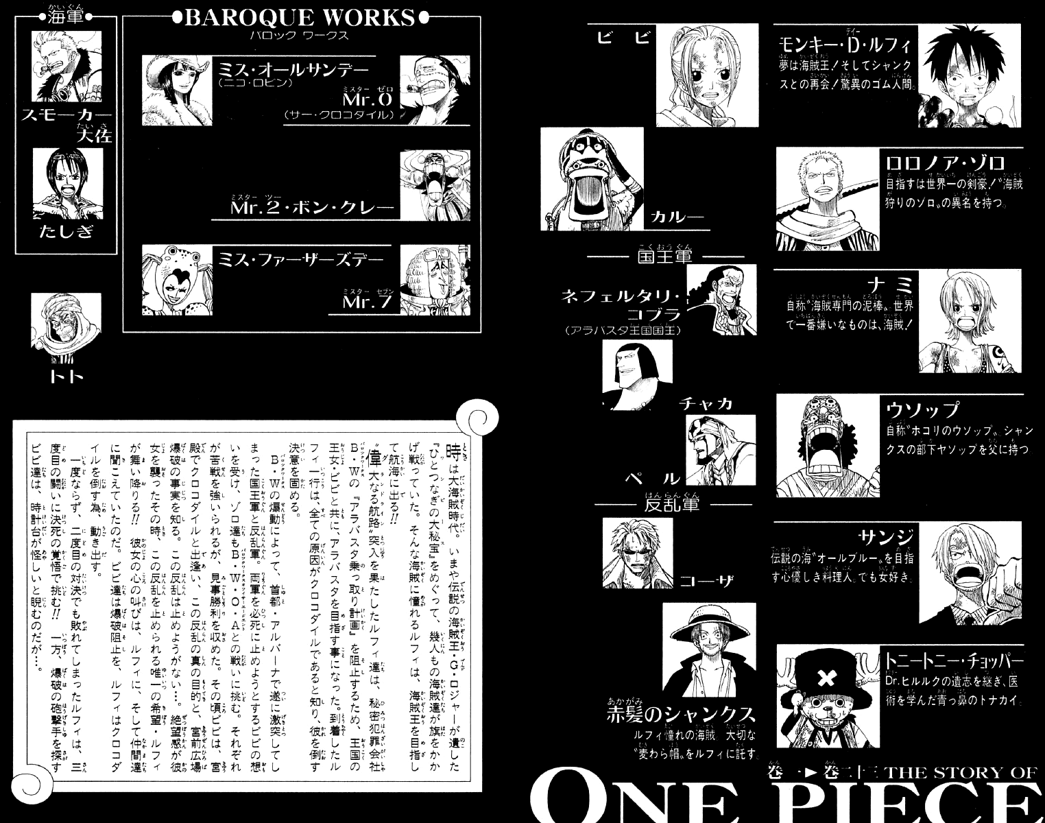 Gol D. Roger, a man referred to as the King of the Pirates, is set to be executed by the World Government. But just before his demise, he confirms the existence of a great treasure, One Piece, located somewhere within the vast ocean known as the Grand Line. Announcing that One Piece can be claimed by anyone worthy enough to reach it, the King of the Pirates is executed and the Great Age of Pirates begins. Twenty-two years later, a young man by the name of Monkey D. Luffy is ready to embark on his own adventure, searching for One Piece and striving to become the new King of the Pirates. Armed with just a straw hat, a small boat, and an elastic body, he sets out on a fantastic journey to gather his own crew and a worthy ship that will take them across the Grand Line to claim the greatest status on the high seas. [Written by MAL Rewrite]
