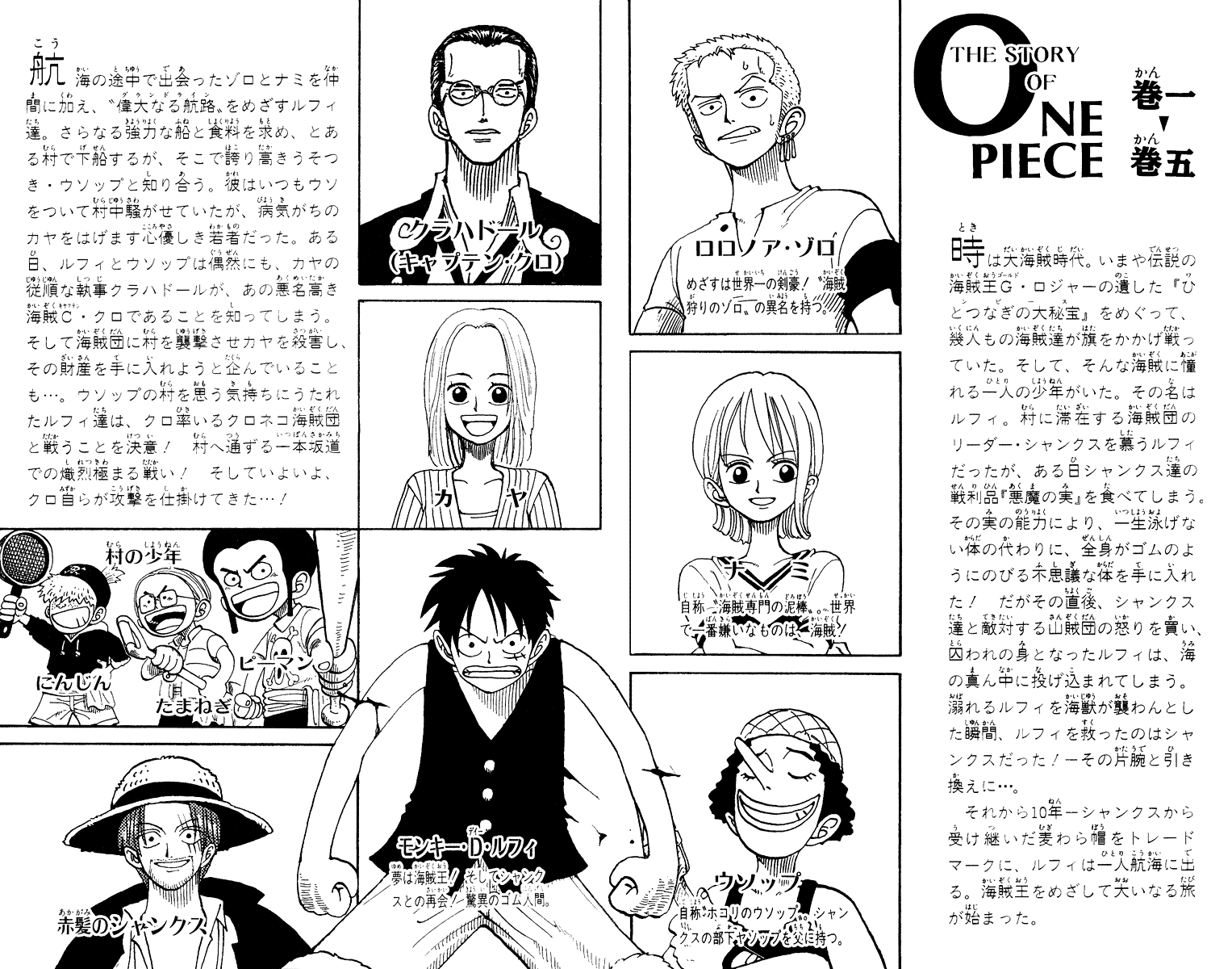 Twenty-two years later, a young man by the name of Monkey D. Luffy is ready to embark on his own adventure, searching for One Piece and striving to become the new King of the Pirates. Armed with just a straw hat, a small boat, and an elastic body, he sets out on a fantastic journey to gather his own crew and a worthy ship that will take them across the Grand Line to claim the greatest status on the high seas.