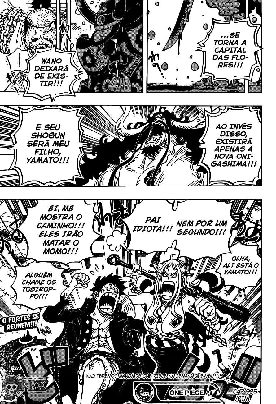 Boa leitura do mangá One Piece – Capítulo 985 , Não se esqueça de curtir e compartilhar. O Mangá One Piece é sempre atualizado no Pizzaria Scan. Não deixe de conferir também outras atualizações de mangá. A lista completa de mangás do Pizzaria Scan está no menu..