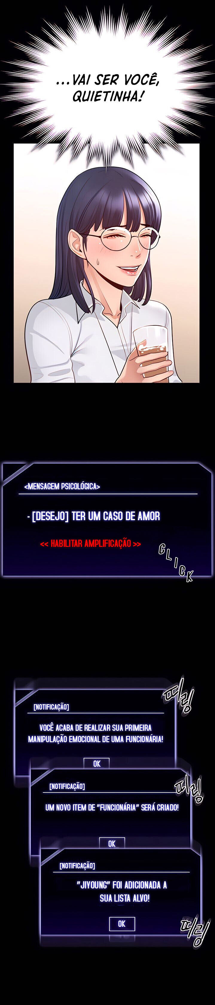 Hyunwu é um típico funcionário de escritório preso a uma rotina cansativa e repetitiva: relatórios, reuniões, tarefas acumuladas e um ambiente corporativo dominado por disputas silenciosas e hierarquias sufocantes. Sua vida segue no automático, sem emoções ou grandes expectativas. Para ele, cada dia parece igual ao anterior, e a monotonia consome qualquer traço de entusiasmo. Tudo muda de forma abrupta quando Hyunwu recebe uma notificação inesperada em seu celular. O aplicativo — estranho e não identificado — apresenta uma função chamada “Mensagens Psicológicas”. A descrição é simples, mas perturbadora: usar frases específicas para influenciar profundamente o comportamento de funcionárias do escritório. Intrigado e desconfiado, ele inicialmente ignora o alerta, acreditando se tratar de spam ou golpe digital. No entanto, ao testar por curiosidade, Hyunwu percebe que as mensagens realmente provocam efeitos reais — e intensos — sobre suas colegas. Mulheres que antes mal o notavam começam a reagir, obedecer e demonstrar comportamentos quase impossíveis de controlar. A partir daí, sua vida vira de cabeça para baixo. Ele se vê diante de um poder perigoso que mistura sedução, manipulação e fantasia. A obra explora a transformação psicológica de Hyunwu, que passa de um funcionário apagado para alguém com controle total sobre pessoas ao seu redor. Porém, junto com as possibilidades, surgem dúvidas, dilemas morais e riscos inesperados. O que era apenas curiosidade começa a se tornar uma obsessão, e Hyunwu precisa decidir até onde está disposto a ir com esse novo poder. “Supervisor Access” mergulha em temas como poder, tentação, ética, desejo e as consequências de controlar a mente humana.