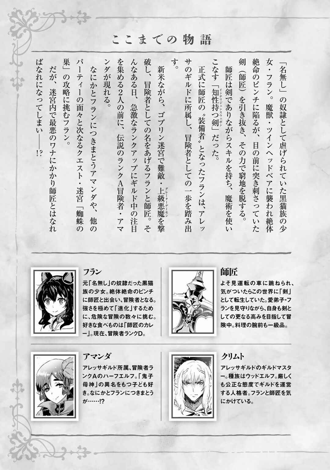 When he realized it, the protagonist was in another world and had become a sword that was stabbed on an altar in a great plain, crowded with devil beast. The world he was in had a game like system; HP, MP, Strength, Vitality, Agility, Intelligence, Dexterity, Titles and Equipment. Following his instinct as a living sword, he traveled to find the one who could be his wielder, until he met with a cat girl that was about to be attacked by a bear type devil beast.