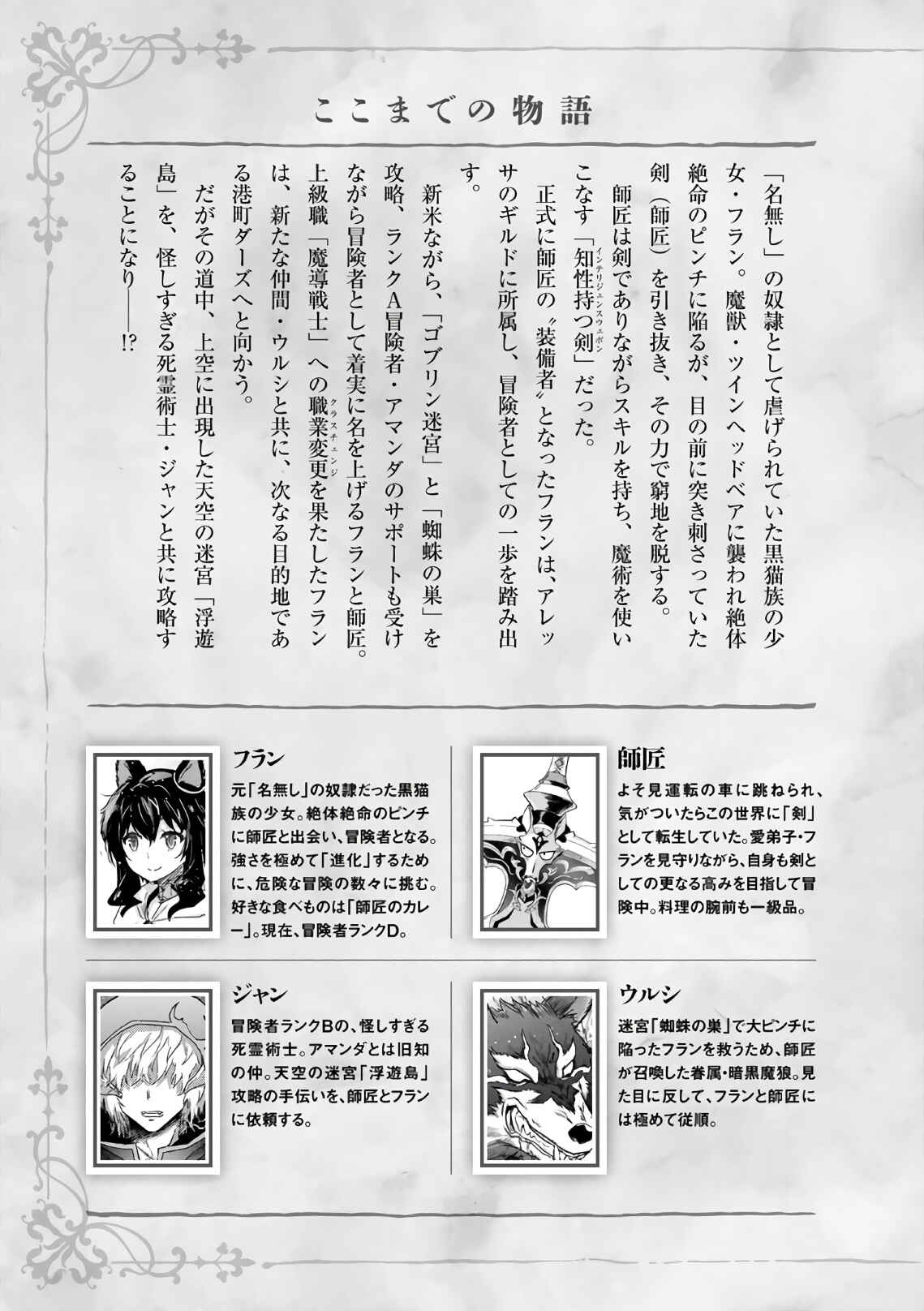 When he realized it, the protagonist was in another world and had become a sword that was stabbed on an altar in a great plain, crowded with devil beast. The world he was in had a game like system; HP, MP, Strength, Vitality, Agility, Intelligence, Dexterity, Titles and Equipment. Following his instinct as a living sword, he traveled to find the one who could be his wielder, until he met with a cat girl that was about to be attacked by a bear type devil beast.
