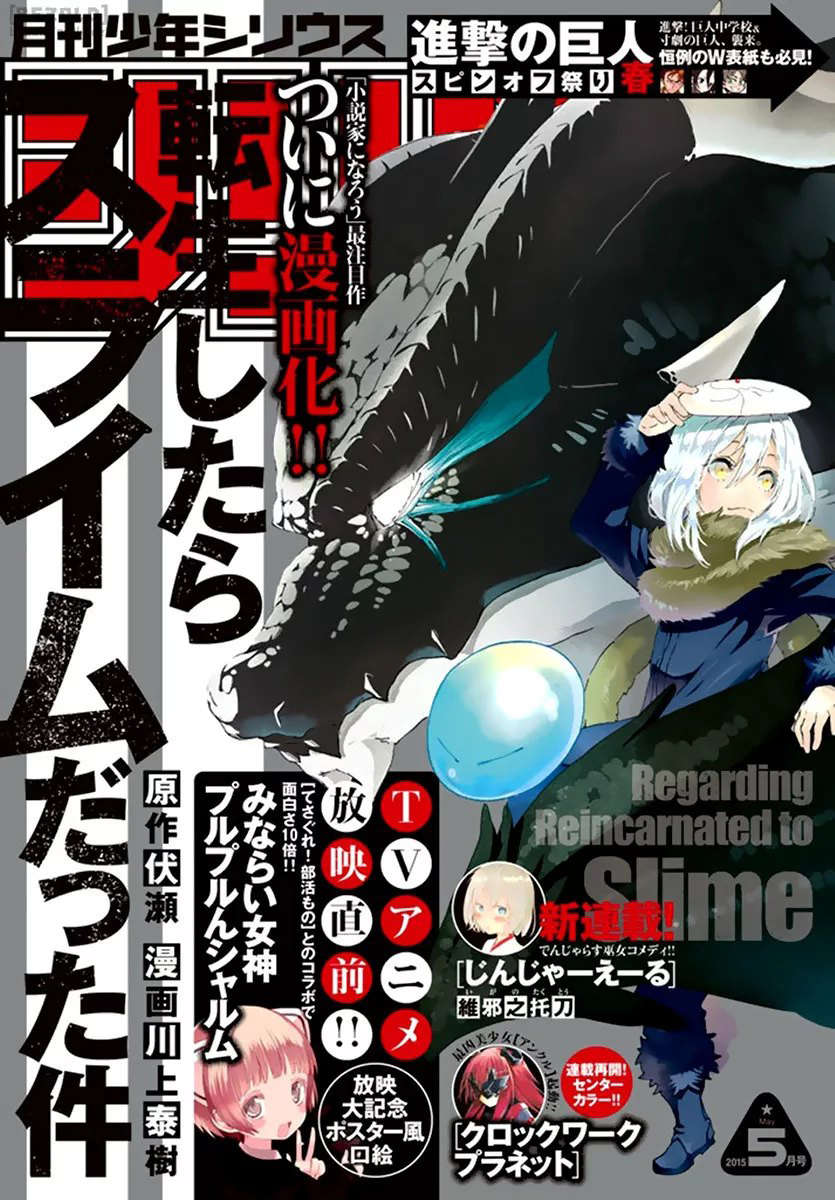 It is just another ordinary day for Satoru Mikami. The sun is shining brightly on the streets of Tokyo, and he is in the midst of a discussion with his colleagues when suddenly he gets stabbed by a passing robber. The average 37-year-old corporate worker is now at death’s door, and he has only one regret—dying a virgin. Fading out, he is startled by a mysterious AI-like voice reciting commands. Satoru abruptly wakes up in the middle of a strange cave, but something odd has happened: he is now a goop of slime! Thanks to his new body, he has acquired the skill to absorb anything and obtain its appearance and abilities. While testing out his newfound powers and exploring the cave, he stumbles upon a massive dragon named Veldora, who has been sealed away for the past three hundred years. After quickly befriending the beast, Satoru decides to help him escape; in exchange, Satoru is bestowed a new name: “Rimuru Tempest.” Wishing to avoid a life like his boring and mundane past, Rimuru is about to set out on a grand quest that will change his own destiny and the fate of his new world. [Written by MAL Rewrite]