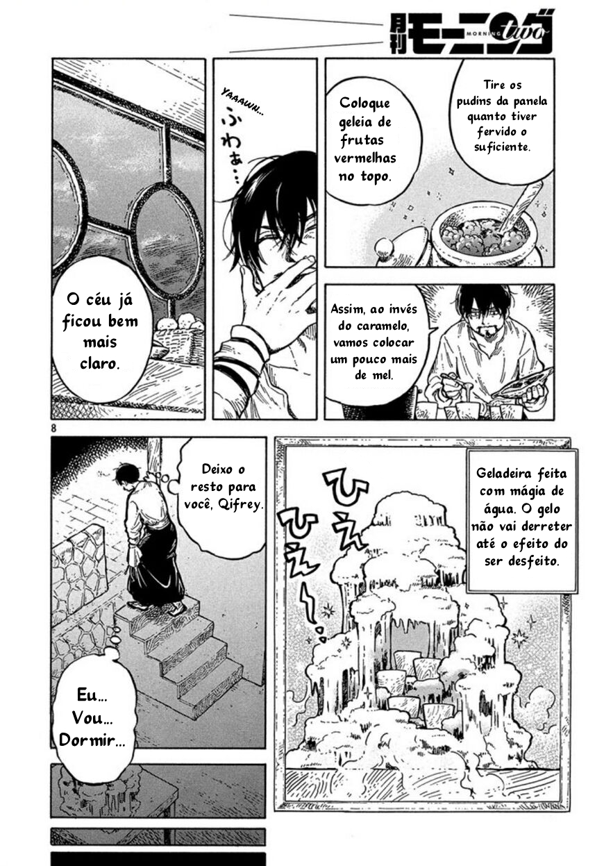 The only time adults have to themselves is after the Sun goes down and the kids are in bed—that’s just as true in the magical world! During the day, the atelier bustles with the cries and magical misfires of little witches learning how to cast spells and get along. But nighttime is Qifrey and Olruggio’s time, to laze in the kitchen, cook, eat, and chat. [Kodansha]