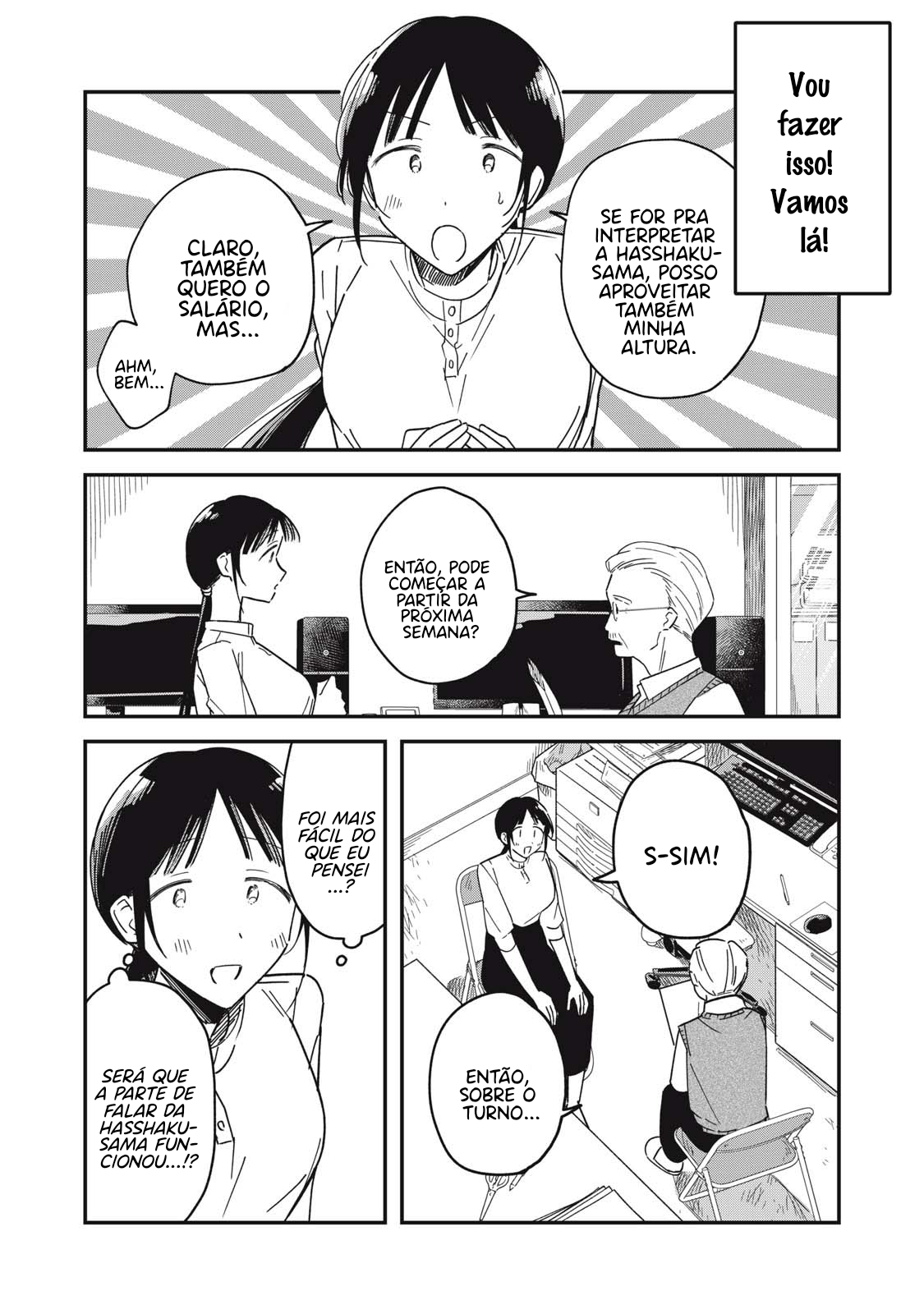 Yachiru is a hasshakusama youkai living in the human world. Because the prevailing public image of hasshakusama is that they're lewd, her powers have weakened and her height has shrunk from its original 8 shaku (240 cm) to about 190 cm. She strives to correct that impression, but each day is another failure. However, while at the cinema to study horror films, she meets Seiichirou, a young man who is a huge fan of hasshakusama. That's when Yachiru realizes that whenever Seiichirou praises her, her height returns to its original size...!!!